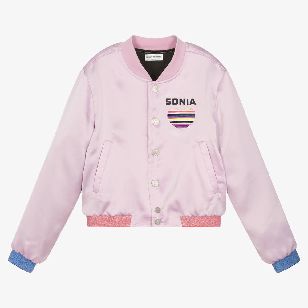 Lilac purple bomber jacket for teen girls by Sonia Rykiel Paris, with eye-catching black printed logos and embroidered rainbow-striped hearts on the back and chest. This stylish jacket has glittery blue and pink trims on the cuffs and hem for an added touch of glamour. There are slanted front pockets, logo-branded popper fastenings and a silky lining. Lightweight and comfortable, this fashion-forward piece is made in silky smooth satin for a casual but luxurious look.