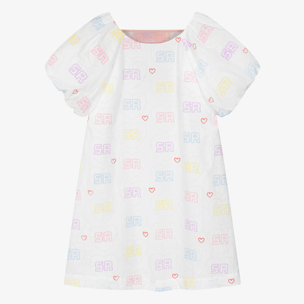 Feminine yet casual, this white dress for teen girls by Sonia Rykiel Paris has puffed short sleeves. It is embroidered with a monogram logo heart design in pretty pastel colours and has a sparkly branded elastic detail on the open V-back, for a signature look. Comfortable to wear, it has an A-line silhouette and is made from soft cotton with a lightweight lining.