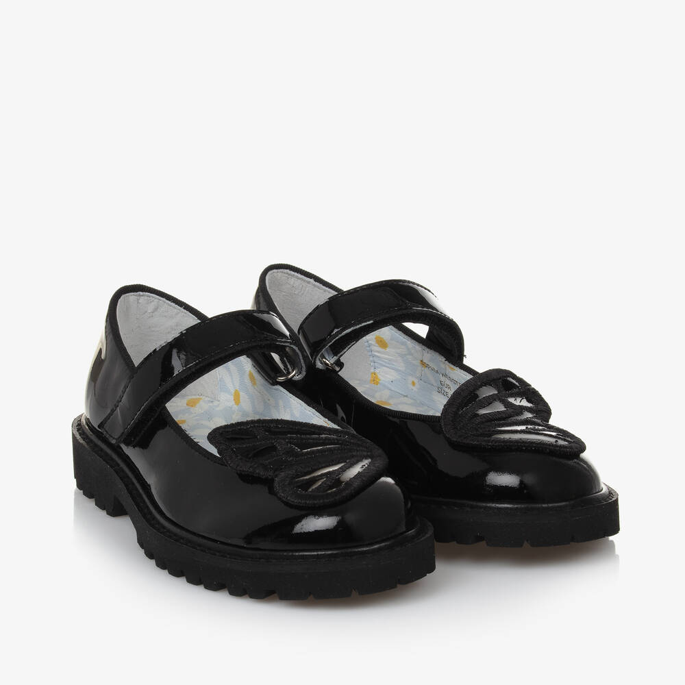 Smart black shoes for girls by British designer Sophia Webster Mini. They are made in shiny patent leather and trimmed with the designer's signature butterfly wings on the toes. The smooth leather insoles are cushioned for comfort and printed with a pretty daisy pattern. Suitable for school, they fasten easily with a velcro strap and have a chunky non-slip rubber sole for good grip.