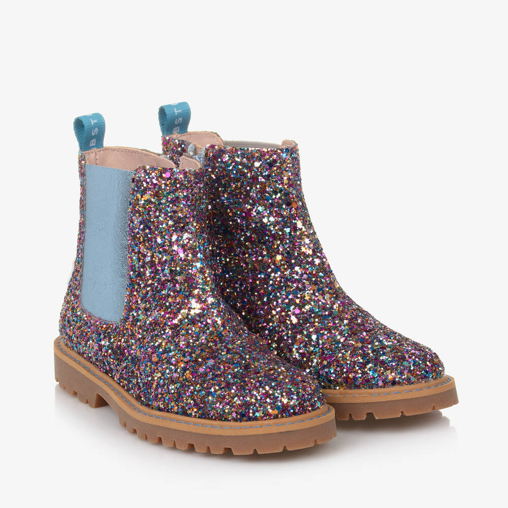 Sparkling with colourful glitter and ideal for a party, these eye-catching chesea boots for girls are by British designer Sophia Webster Mini. To help with dressing, they have an elasticated insert on one side, with a zip fastening on the other. Lined in smooth leather, they have a comfortable cushioned insole, with rubberised soles for good grip. Adding a designer touch, they have a branded pull tab on the back of the heel, with a rubberised logo tab.