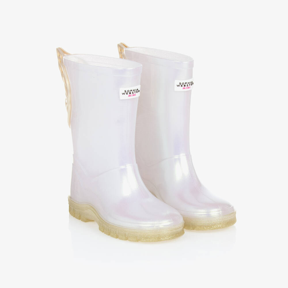 Pearlescent white rain boots for girls by British brand Sophia Webster Mini. They have the designer's signature butterfly wings on the back, in ivory with glittery gold detailing. Smooth and flexible, they have ridged glittery soles for good grip and a comfortable fabric lining. A rubberised logo tab can be seen on the front.