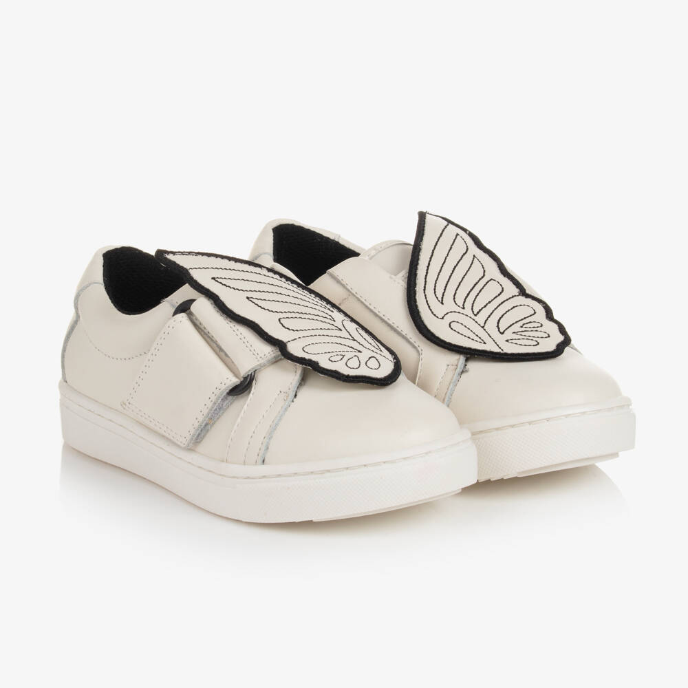 Lovely off-white leather trainers for girls by Sophia Webster Mini. Cute and comfortable, they have a soft fabric lining and cushioned insoles. A signature of the brand, they feature a single, black and off-white embroidered butterfly wing on each shoe, giving a whole butterfly effect when the feet are together. They fasten with a velcro strap across the foot and have non-slip rubber soles for good grip.