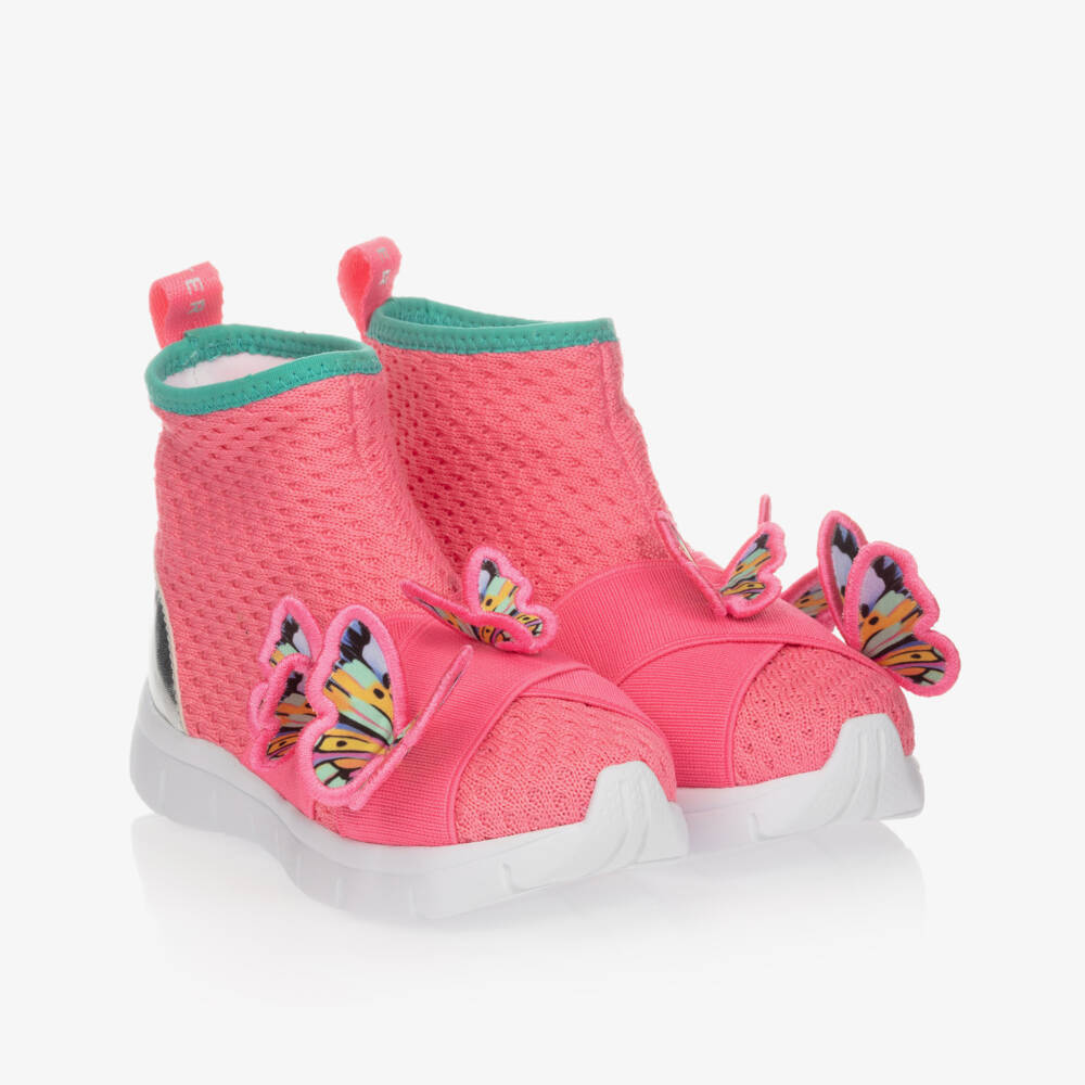 Girls pink sock trainers by Sophia Webster Mini, with colourful embroidered butterflies. Made in stretchy mesh with silky jersey lining and elasticated strap details, they are easy slip on. They have soft faux leather insole, white rubber outsole and green cuffs. There are silver faux leather trims with a white rubber logo on the heel and logo branded pink pull-tape on the back.