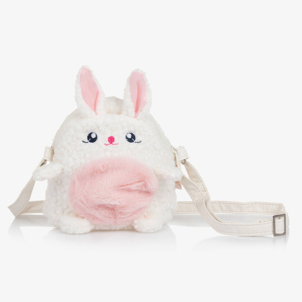 A cute ivory and pink bunny rabbit bag for girls by Danish brand Souza, made from soft and lightly textured bouclé. A fun play accessory, the main compartment is fully lined and closes with a zip. It has adorable pop-up ears on the top and soft, plush fabric on the front. The faux leather shoulder strap is adjustable for a good fit.