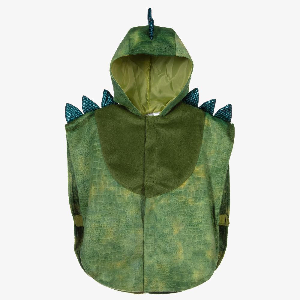 Green dinosaur hooded cape costume for boys by Souza. Made with soft velour, this fun cape has an all-over scaly raised pattern, and shimmering blue and black soft spikes on the shoulders, hood and back. There are elasticated velcro fastening straps on the sides.