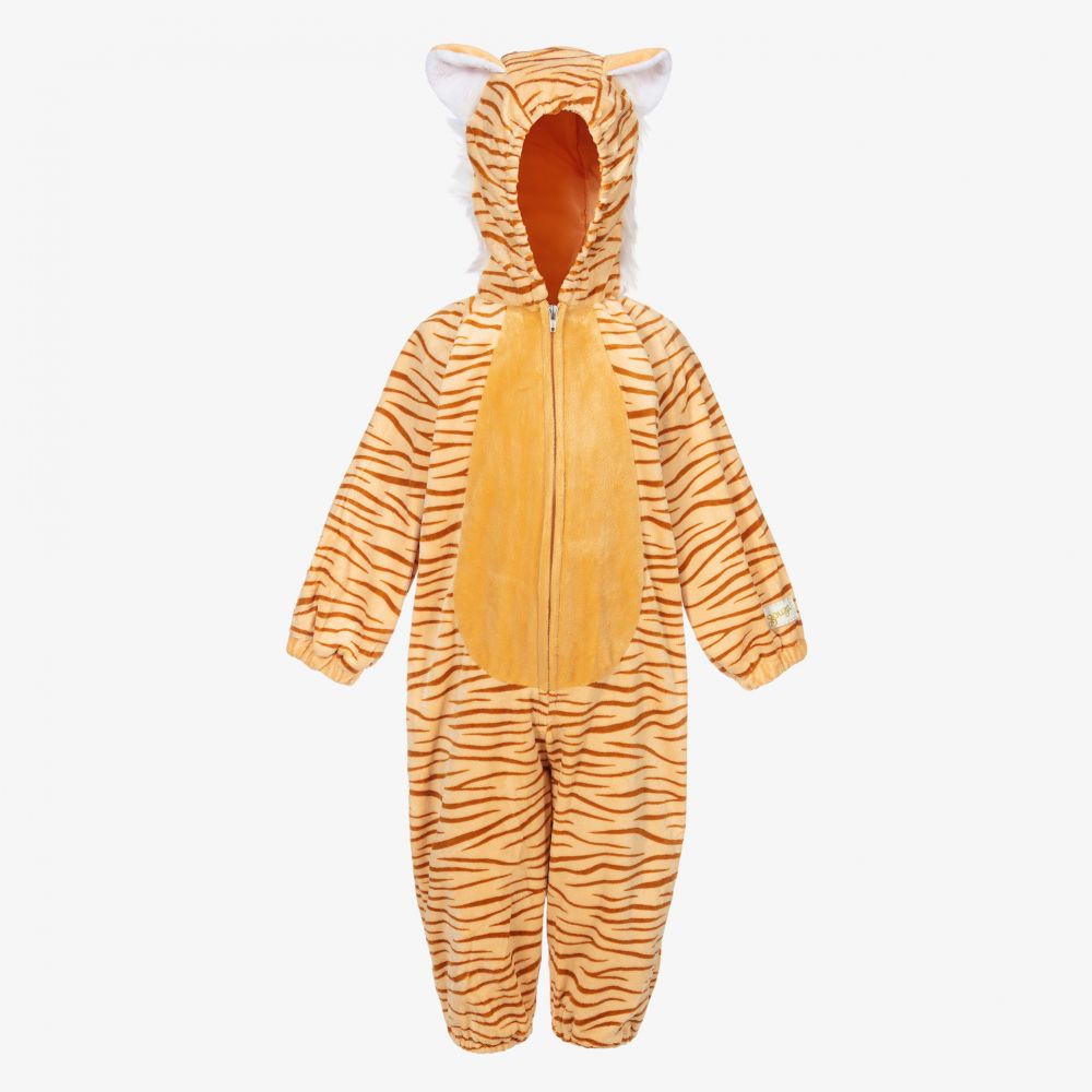 Orange striped tiger costume for boys and girls by Souza. Made with super soft and stretchy velour, this fun costume has cute ears with white faux fur detailing on the hood, a striped little tail on the back, and elasticated cuffs.