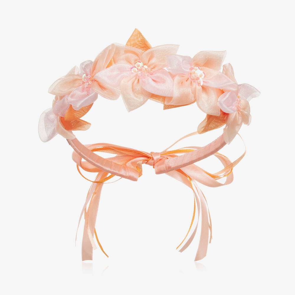 A lovely peach pink floral garland hairband for girls by Souza. The satin ribbon covered band has internal grips for a secure fit. The top is decorated with pink and orange chiffon flowers with sparkly sequin buds. There are satin ribbons to tie on the back.