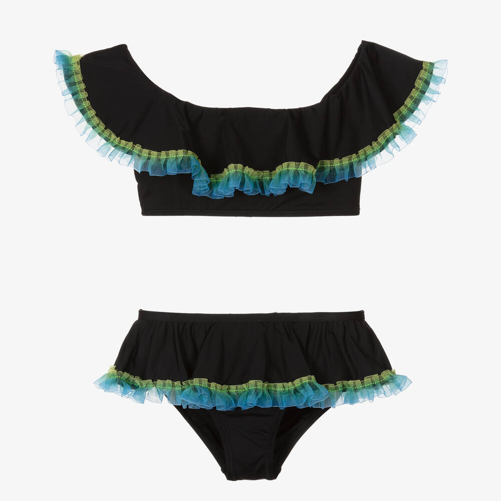 A pretty black bikini for girls by Stella Cove, in a silky smooth and stretchy fabric. Eye-catching for beach or poolside wear, it has ruffled trims with shimmery green and blue chiffon edges.