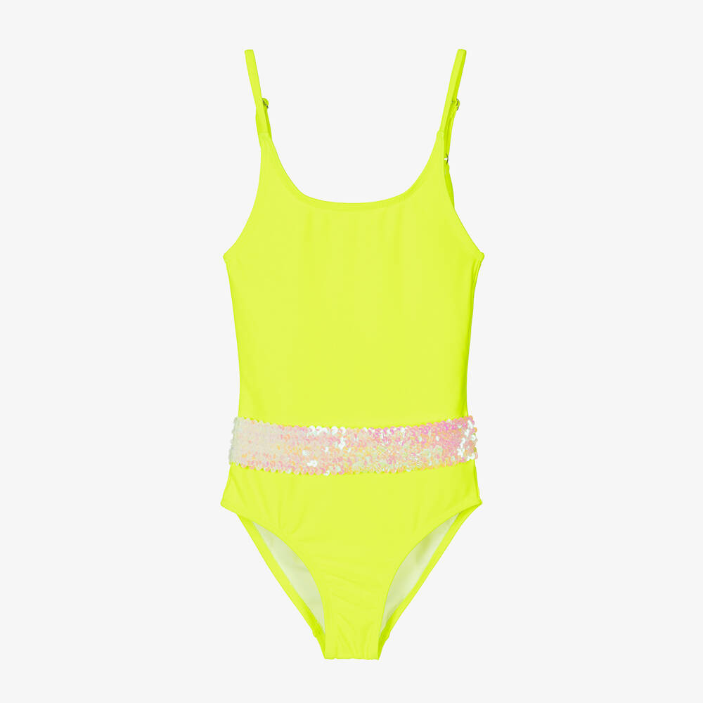 Striking neon yellow swimsuit for girls by Stella Cove, in a bright and vibrant holiday-inspired vibe. This stand-out swimsuit has an iridescent sequin belt around the waist for a feminine look. It has a low scoop back for a contemporary touch, and adjustable shoulder straps for the best fit. Lined for comfort and modesty, it is silky, stretchy and lightweight for days spent at the pool, beach or resort.