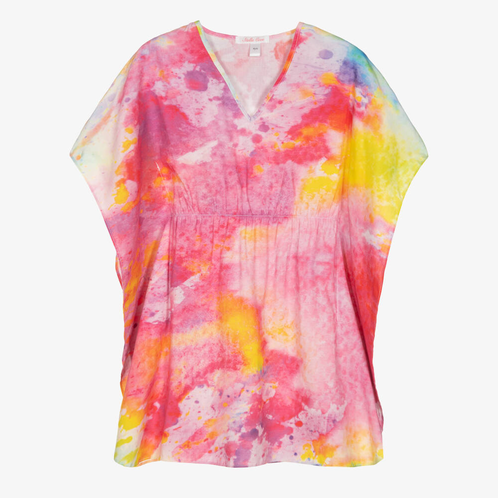 Fun pink, red and yellow kaftan for girls by Stella Cove, ideal as a cover-up at the beach or pool. Soft and lightweight to keep your little girl cool, it has a fun, colourful paint splatter design all-over. The floaty sleeves and relaxed shape are effortlessly chic, whilst the elasticated trim on the waist ensures a better fit.