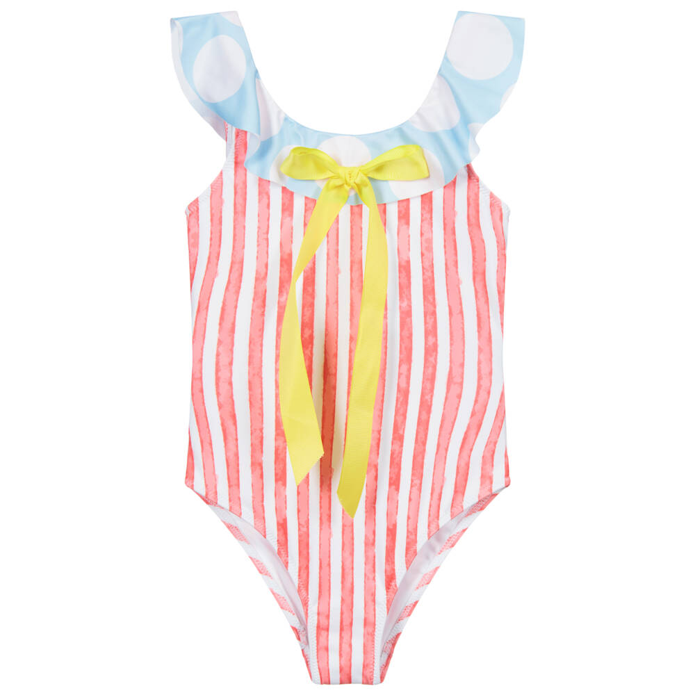 Red and white striped swimsuit for girls by Stella Cove. It has a blue and white polka dot ruffle trim, with a yellow grosgrain ribbon.