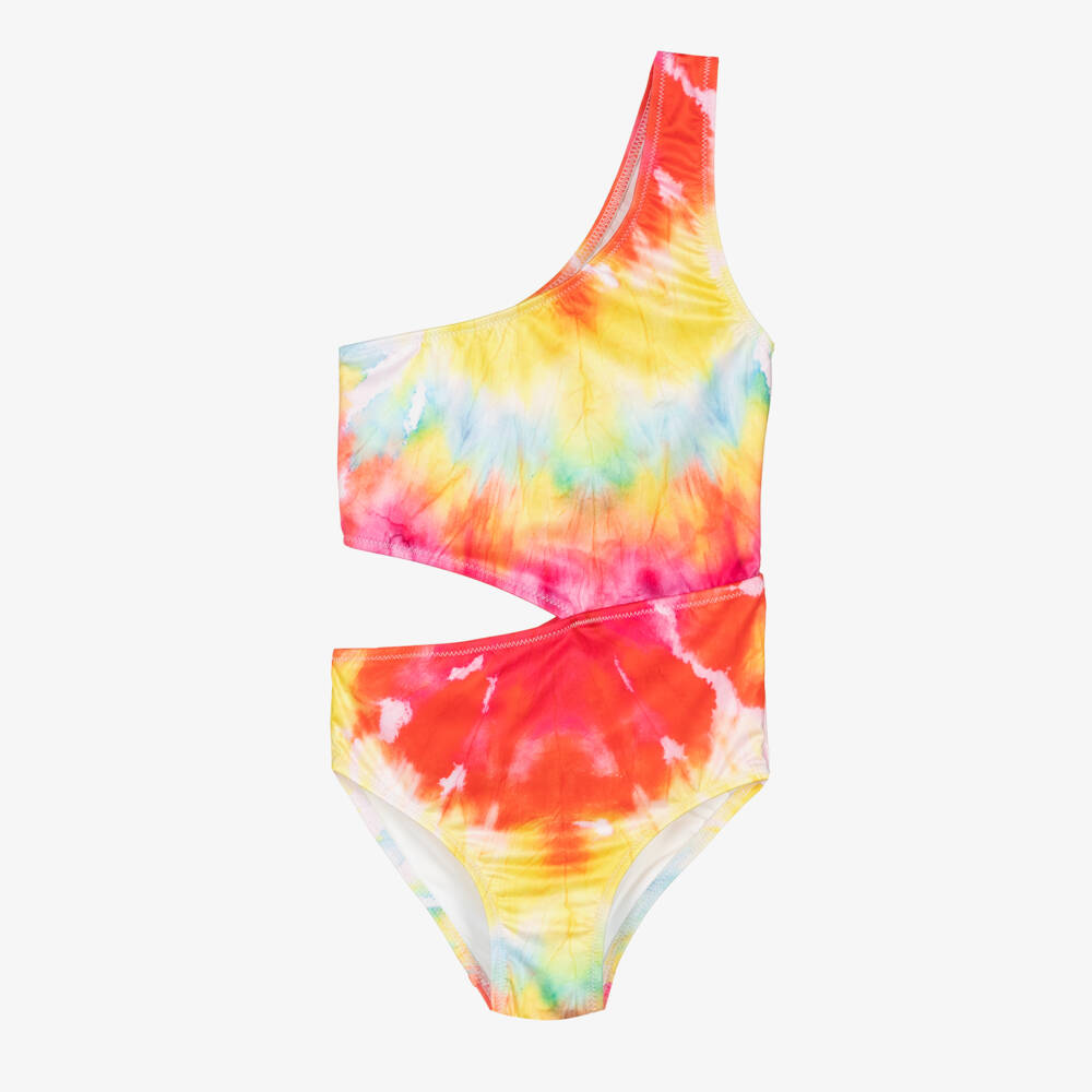 Bright and playful, this multicoloured tie-dye swimsuit for girls is by Stella Cove. In a one shoulder style, this asymmetric swimsuit has a cut out waistline for an eye-catching look. It is smooth, stretchy and comfortable with a breathable lining.
