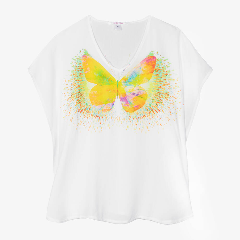 Ideal for the chilling by the pool, beach or resort, this pretty white kaftan for girls by Stella Cove is exclusive to Childrensalon. Styled with striking green and orange paint splatters, it has a beautiful, bright butterfly printed on the front and back for an eye-catching look. It has a flattering V neckline and super wide sleeves, ideal for keeping cool and covered in the sunshine.