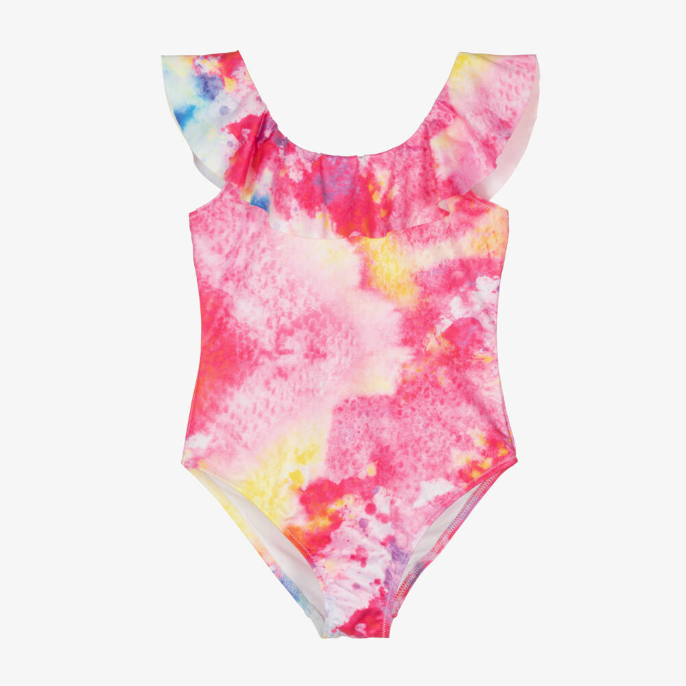 In a pink and yellow tie-dye pattern, an eye-catching swimsuit for teen girls by American brand Stella Cove. This stylish one-piece has a scooped neckline with a feminine ruffle trim, and a pretty low back. Silky smooth and stretchy, the swimsuit is fully lined for added comfort.