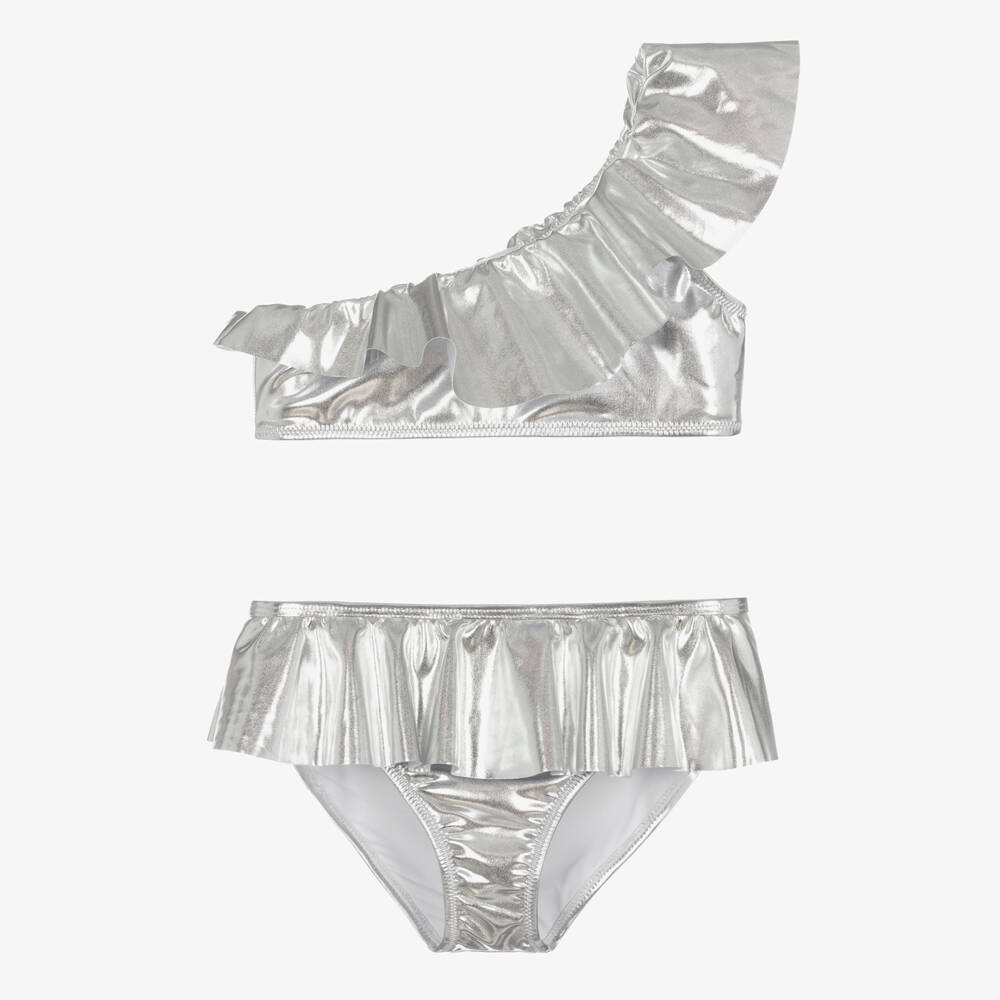 Super stylish for teen girls, this shiny metallic silver bikini by beachwear brand Stella Cove is an exclusive to Childrensalon. Designed in an asymmetric, one-shoulder style with dramatic ruffles, this glitzy ensemble will add a touch of glamor to the resort wear look. Stand out without compromising comfort, both pieces are smooth, stretchy and fully lined.