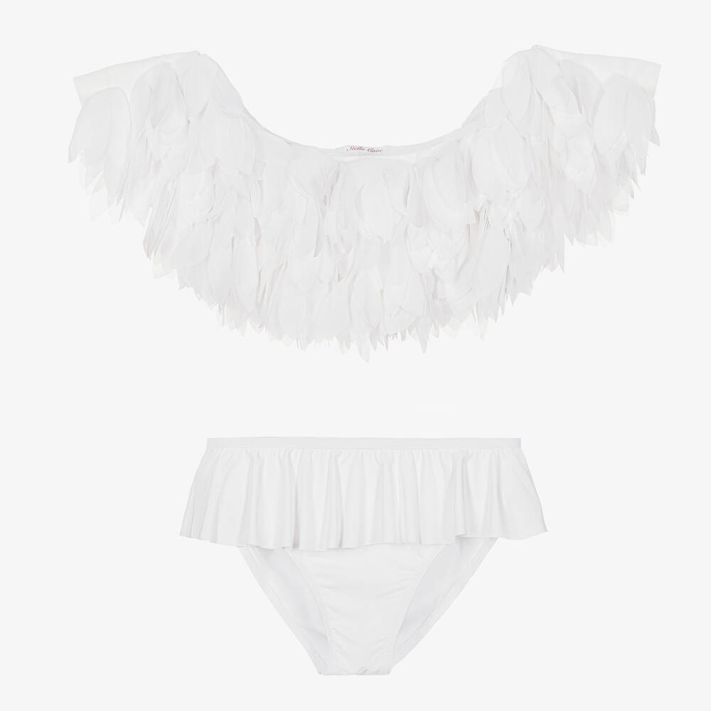 Absolutely gorgeous, this white bikini for teen girls is from beachwear designer Stella Cove. Stylishly off-the-shoulder, the top is trimmed with pretty flower petal appliqués and ruffle with matching ruffle bottoms to complete the feminine look. Silky smooth and stretchy, both pieces are fully lined for comfort.