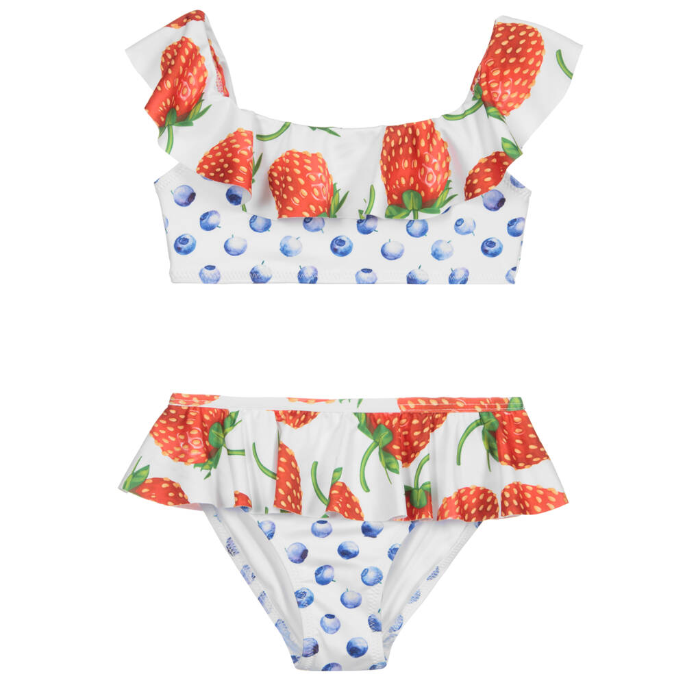 Patterned with a gorgeous red strawberry and blueberry design, a white bikini for girls by Stella Cove. Soft and stretchy, it has a lightweight lining and pretty frills around the top and waist.