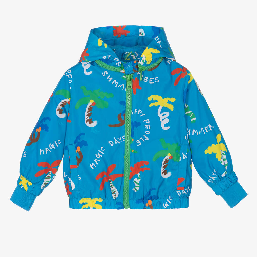 Bright blue jacket for baby boys by British brand Stella McCartney Kids, with a detachable hood. Made in soft, silky, recycled fibres, it is patterned with colourful palm trees and white summery slogans. There are exposed green zip fastenings and useful front pockets. The jacket is lined in soft organic cotton jersey and the sleeves have elasticated cuffs with soft ribbing for added comfort. The Stella McCartney fit can be quite small so choose a size up if you want room to grow.