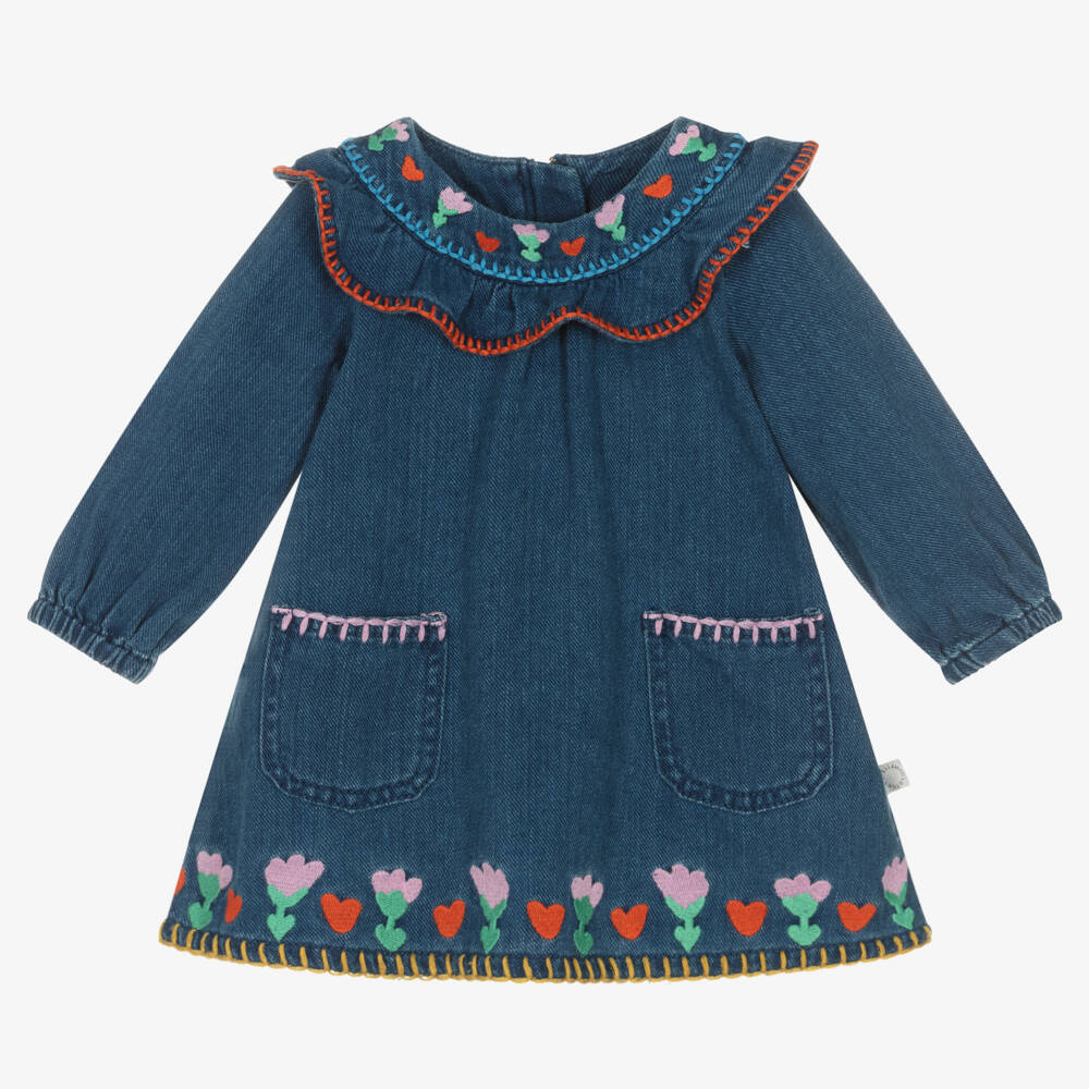 Delightful blue dress for baby girls by British designer Stella McCartney Kids, made in super soft, organic cotton denim. Exquisitely embroidered with pink flowers and red hearts, it has a homespun, folklore appeal. There is colourful blanket stitching on the ruffle around the neck, the front patch pockets and the hemline. The dress fastens with an exposed zip around the back. The Stella McCartney fit can be quite small, so choose a size up if you want room to grow.
