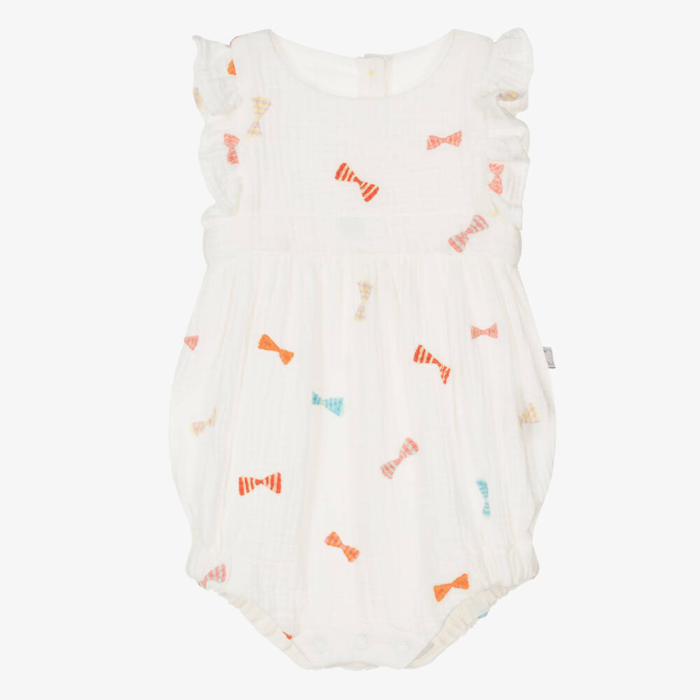 An ivory shortie for baby girls by British designer Stella McCartney Kids. Made in soft organic cotton cheesecloth, this gentle-on-the-skin shortie is designed with sweet ruffles on the shoulders and whimsical buttons on the back in a rainbow of colours. Embroidered pink, orange and blue bows add a fun element to the sleeveless design. There are poppers between the legs to help make changing simple. The Stella McCartney fit can be quite small so choose a size up if you want room to grow.