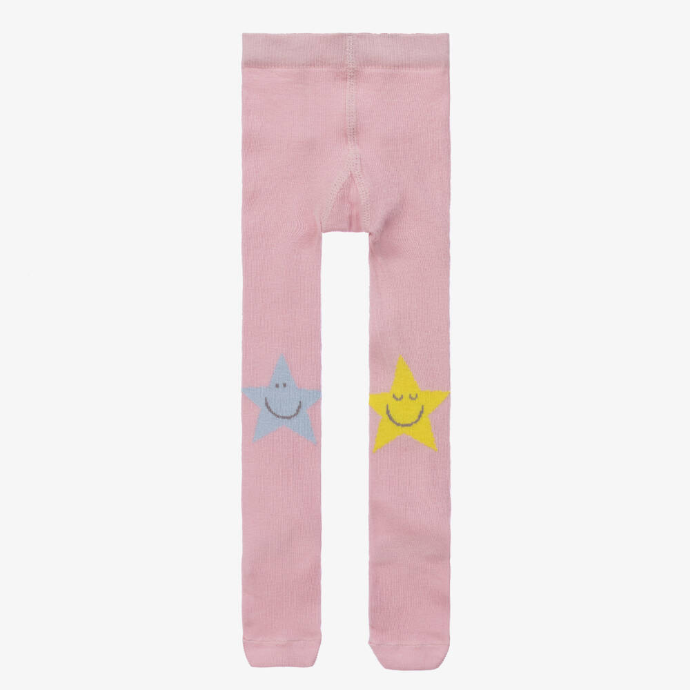 Baby girls pink cotton blend knitted tights by Stella McCartney Kids. Soft and stretchy, these cosy tights have an intarsia weave of a yellow and blue star, with a happy face design across the knees. They have a gently elasticated waistband for a comfortable fit on little tummies. The Stella McCartney fit can be quite small so choose a size up if you want room to grow.