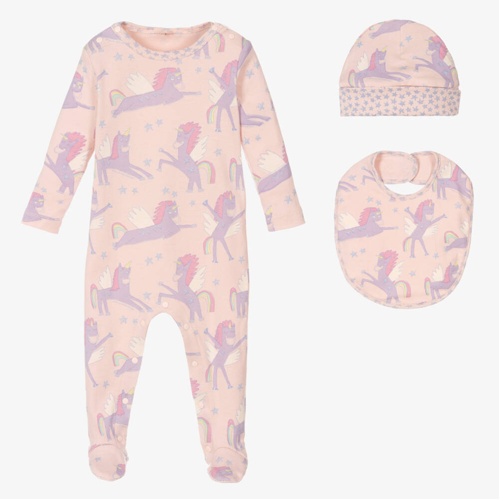 Dreamy lilac unicorns pattern this adorable pink babygrow, hat and bib set for girls by Stella McCartney Kids. Made in soft and comfortable cotton jersey, all three pieces feature charming unicorns with rainbow tails and the British designer's signature star print trim. The babygrow fastens with poppers on the shoulders and between the legs and the bib has adjustable popper fastenings. They are packed in a fun gift box for an extra special touch. The Stella McCartney fit can be quite small so choose a size up if you want room to grow.