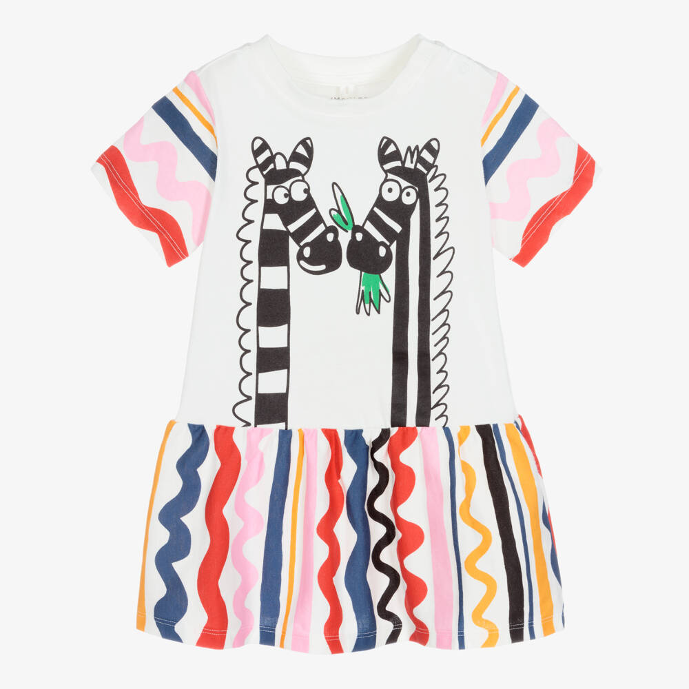 White dress for baby girls by British designer Stella McCartney Kids, with a black and white zebra print on the front. Made in comfortable organic cotton jersey, the sleeves and skirt are patterned with colourful stripes. There are useful popper fastenings on one shoulder.