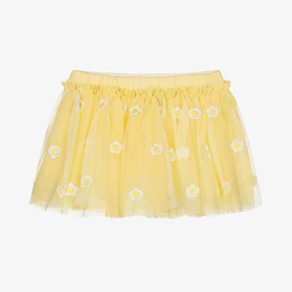 From British designer Stella McCartney Kids, a gorgeous yellow tulle skirt for baby girls. Patterned all over with embroidered white and yellow daisies, it has a stretchy waistband and layers of super soft tonal tulle for a pretty effect. This easy-to-wear style is lined in lightweight cotton for comfort. The Stella McCartney fit can be quite small so choose a size up if you want room to grow.