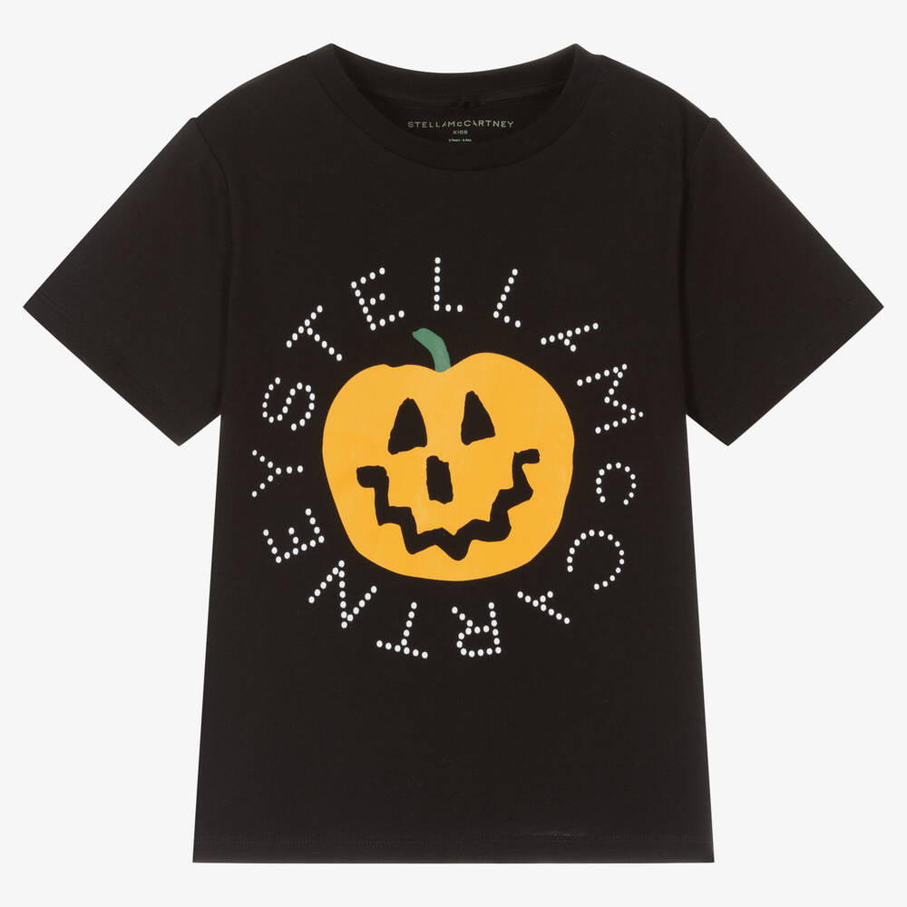 In the spirit of the spooky season, this black crew neck T-shirt for boys and girls is designed by Stella McCartney Kids. Made in soft organic cotton jersey, it has a bright orange pumpkin motif on the chest with the brand's circular logo printed in white. The Stella McCartney fit can be quite small so choose a size up if you want room to grow.