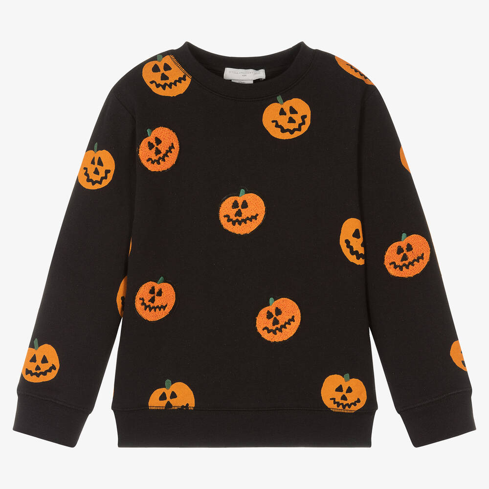 Spooky black crew neck sweatshirt for boys and girls, by Stella McCartney Kids. Made in soft organic cotton jersey, it has an orange pumpkin print with textured boucle trims. The Stella McCartney fit can be quite small so choose a size up if you want room to grow.