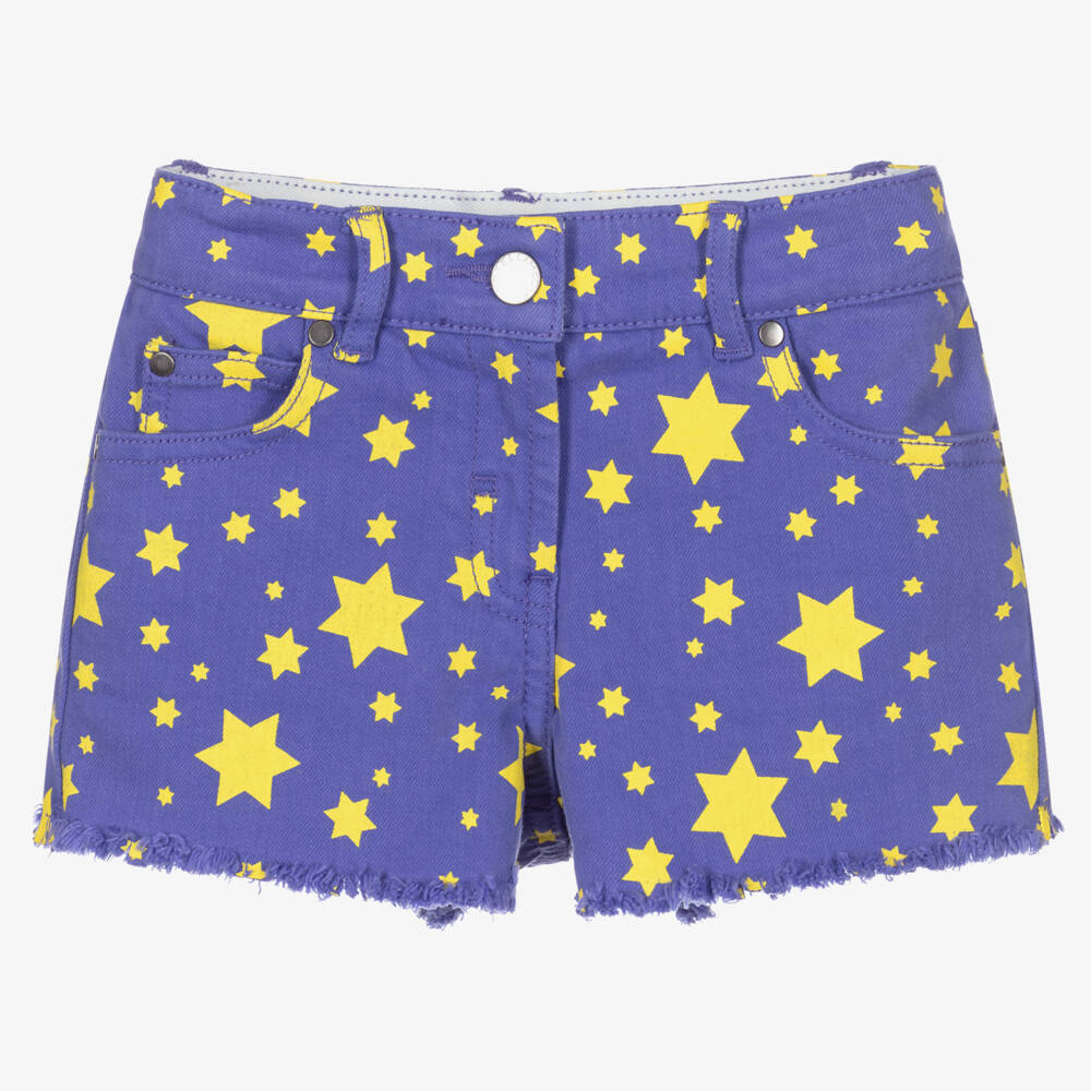 In indigo blue, these Mini-me organic cotton denim shorts for girls are by Stella McCartney Kids. Taken from the adult collection and inspired by a song from The Beatles, they have distressed hems and an all-over yellow star print. They have five pockets, an adjustable waist, with a zip and button fastening. There is a logo tab on the back waistband.