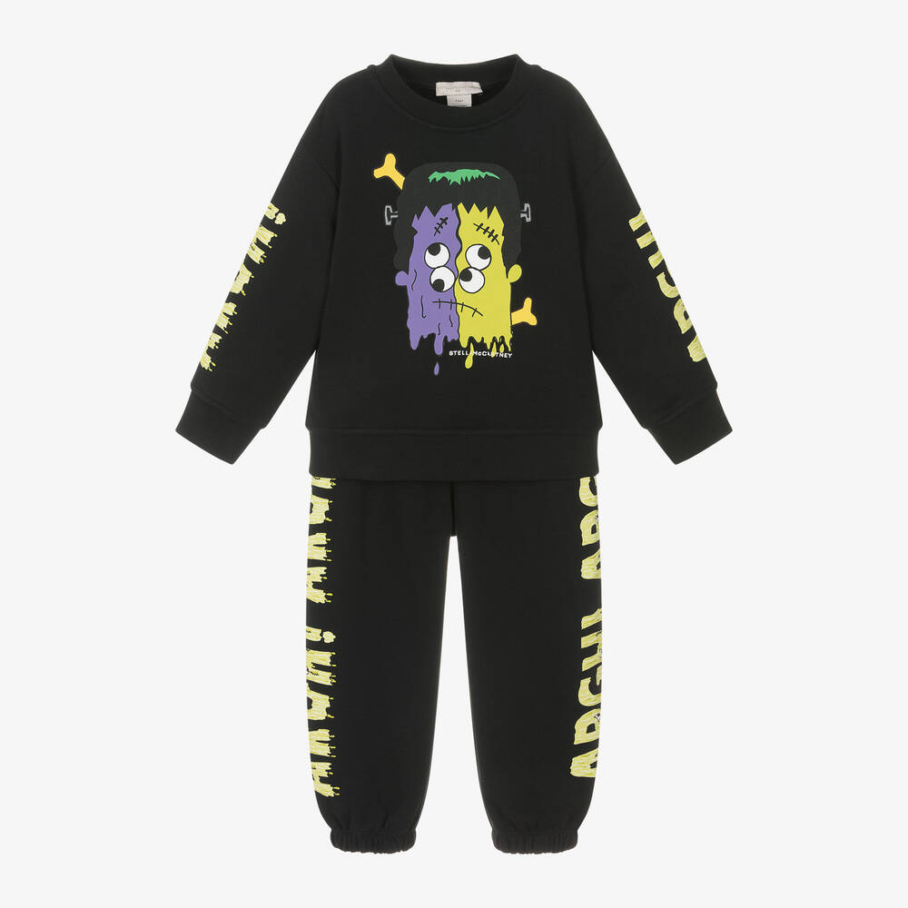 Ideal for Halloween, this black tracksuit for boys is by Stella McCartney Kids. Casual and comfortable, it is made in soft organic cotton jersey, with ribbed trims. The front of the sweatshirt is printed with a scary Frankenstein graphic in purple and green, with 'Argh!' printed in spooky letters down the sleeves. With the same spooky print down the sides, the joggers have an elasticated waist for an ideal fit, with a useful patch pocket on the back. The Stella McCartney fit can be quite small so choose a size up if you want room to grow.