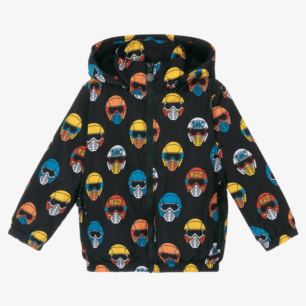 Black windbreaker jacket for boys from Stella McCartney Kids, with a motorcross-inspired colourful helmet print. Made in silky smooth recycled fabric with a soft plush fleece lining, it has a detachable hood and elasticated cuffs and hem for added protection and warmth. The front zip and zip-up pockets have branded pulls for a discreet designer finish.