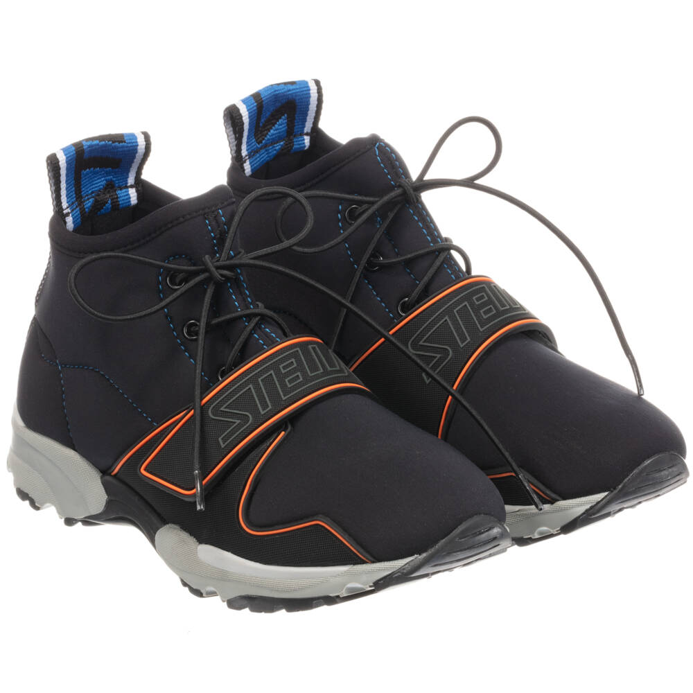 Boys black high-top trainers from Stella McCartney Kids, with blue and orange trim. The outer shoe is made in a lycra-feel fabric, with fabric lining and non-slip rubber outer sole. They have a logo on the heel and on the velcro strap, with faux elasticated laces.