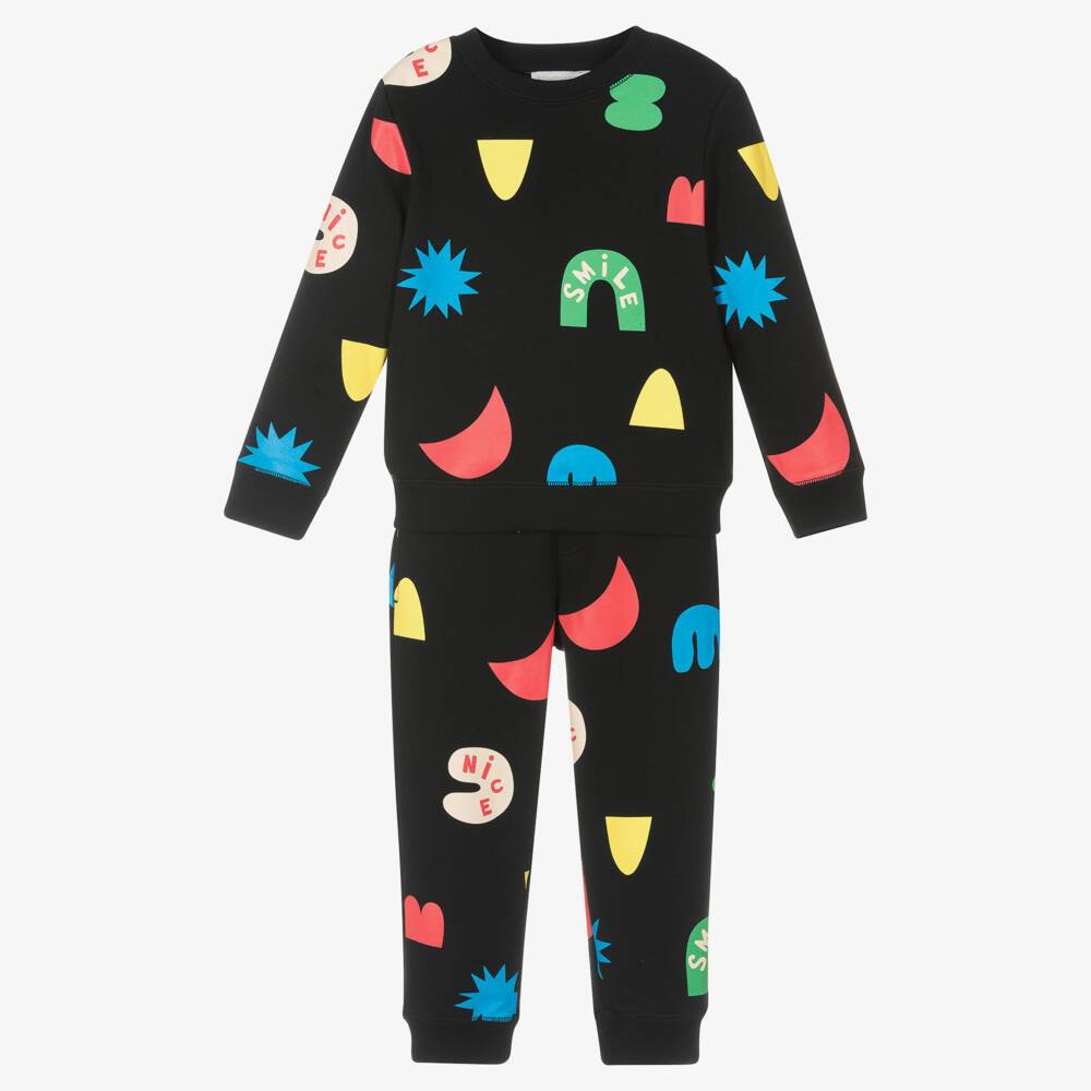 Boys black tracksuit by Stella McCartney Kids, with a colourful shapes print. Made in mid-weight organic cotton sweatshirt jersey, this easy-wearing two-piece has a crew neck top and ribbed cuffs and hem. The matching joggers have an adjustable drawstring waist and elasticated cuffs.