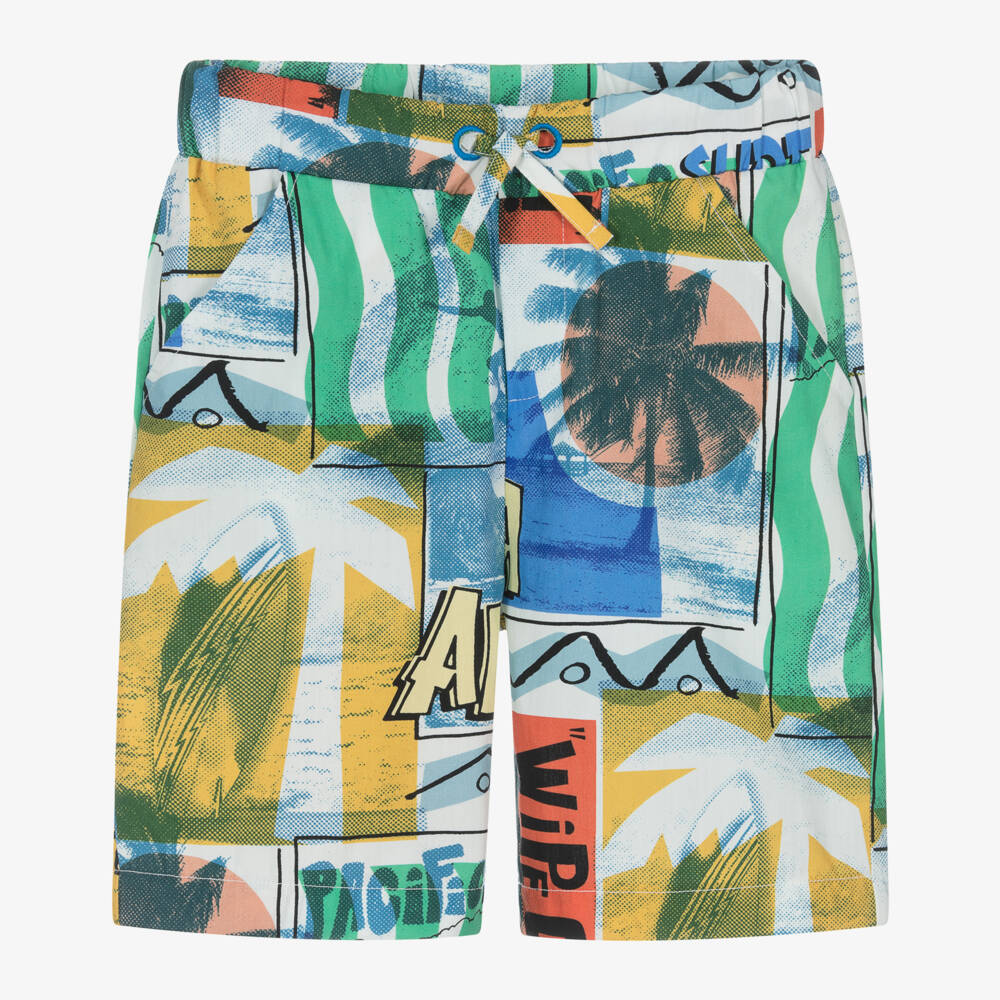 Multicoloured organic cotton shorts for boys from Stella McCartney Kids. Made in soft poplin, these casual shorts are patterned in colourful surfing-themed graphics and slogans. Comfortable to wear, they have a gently elasticated waistband with drawstring ties and useful pockets on both the front and back. The Stella McCartney fit can be quite small so choose a size up if you want room to grow.