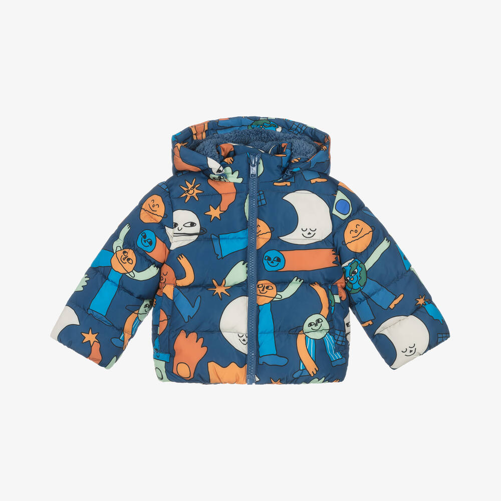 A fun blue puffer jacket for little boys by Stella McCartney Kids, made in silky smooth recycled fabric with mid-weight padding. Ideal for the colder months, this cosmic design is patterned with characterful moons and planets in bold hues of orange and green. It has a beautifully soft fleecy lining, two front pockets and a full-length zip to lock in warmth. The detachable hood secures to the neckline with a zip and is easily removed on dry days. The Stella McCartney fit can be quite small so choose a size up if you want room to grow.