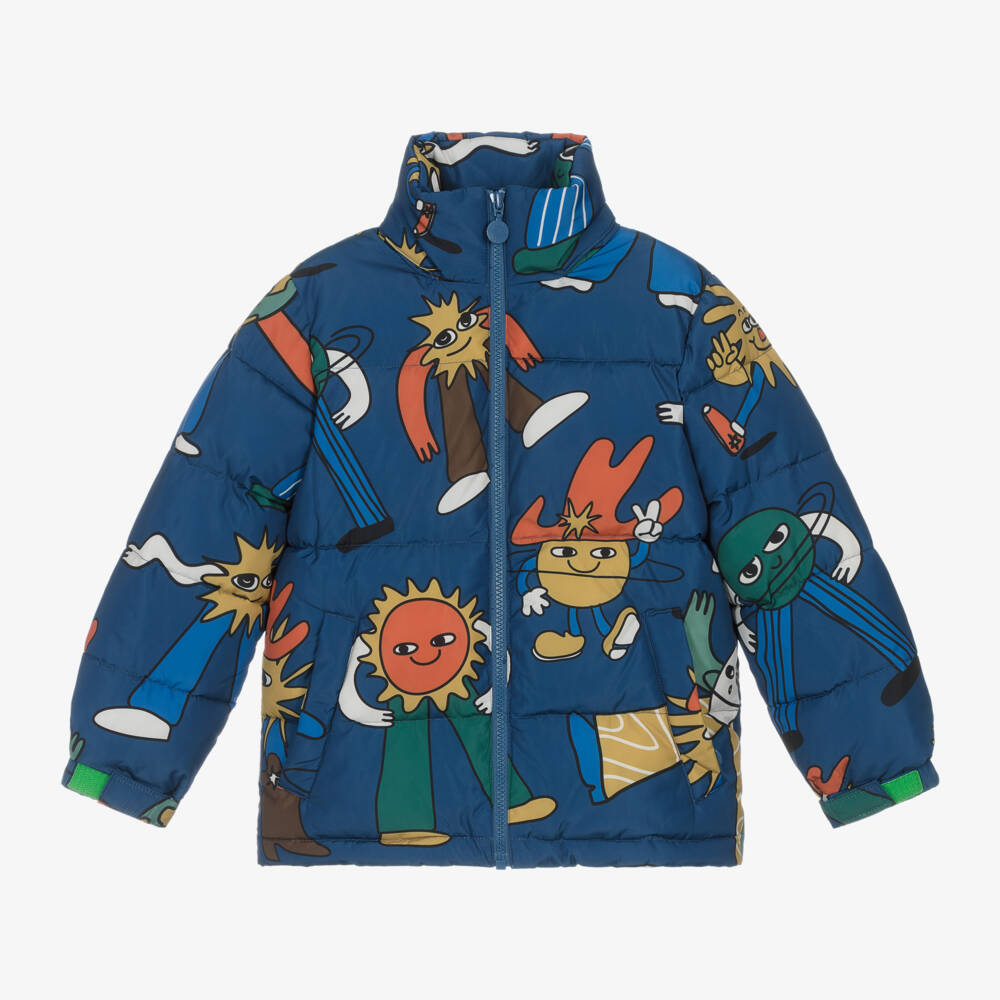 Blue zip-up puffer jacket by for boys by Stella McCartney Kids, with a useful, pack-away hood. Adding the British designer's playful touch, it is patterned with colourful cosmic characters with a fun Western vibe. Made with recycled fibres, it has a silky smooth exterior, a soft teddy fleece lining and mid-weight padding. To lock in warmth, it is designed with a high collar, adjustable cuffs and a drawstring hem. The front pockets secure with zips to keep belongings safe. The Stella McCartney fit can be quite small so choose a size up if you want room to grow.