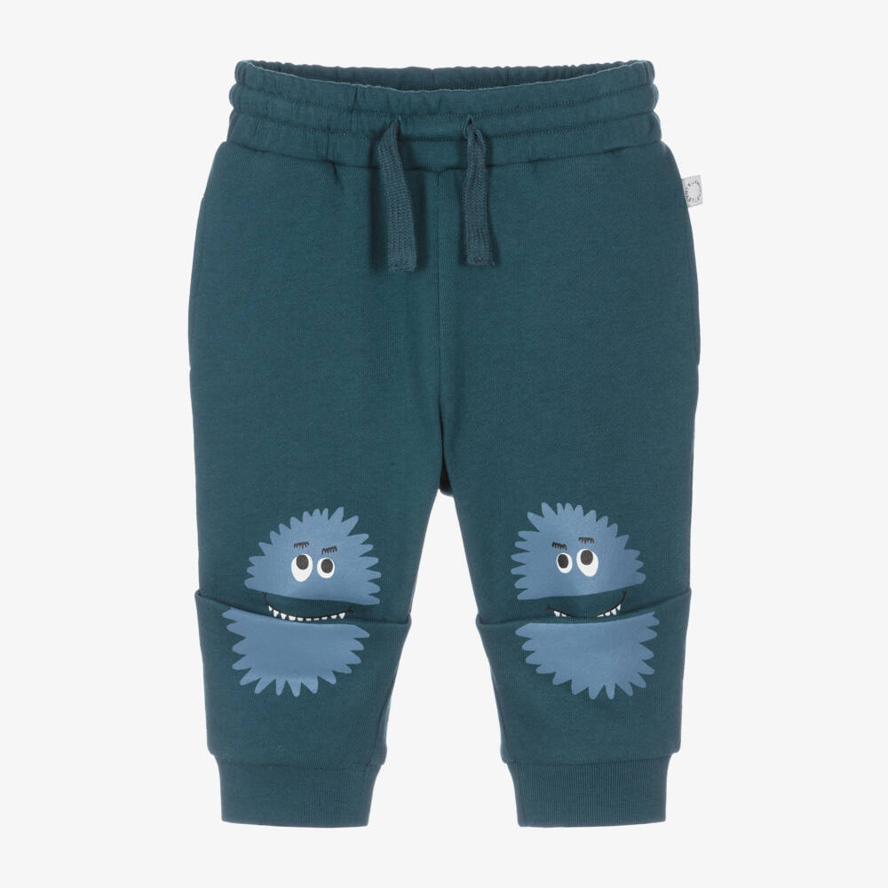Petrol blue organic cotton joggers for little boys from Stella McCartney Kids. Gentle on the skin, these soft and comfortable cuffed joggers are made in stretchy, medium-weight jersey, with a softly elasticated and adjustable waist. With tonal blue monster prints, the joggers have pleated fabric on the knees which unfold to reveal friendly smiling faces. Convenient side pockets and a woven logo tab complete the design. The Stella McCartney fit can be quite small so choose a size up if you want room to grow.