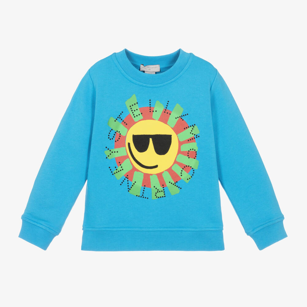 Blue long-sleeved sweatshirt for boys by Stella McCartney Kids, made in soft, mid-weight organic cotton jersey. The front is patterned with a smiling sun wearing sunglasses, reflecting the brand's cool and quirky style. The label's logo surrounds the print for added designer appeal. The Stella McCartney fit can be quite small so choose a size up if you want room to grow.