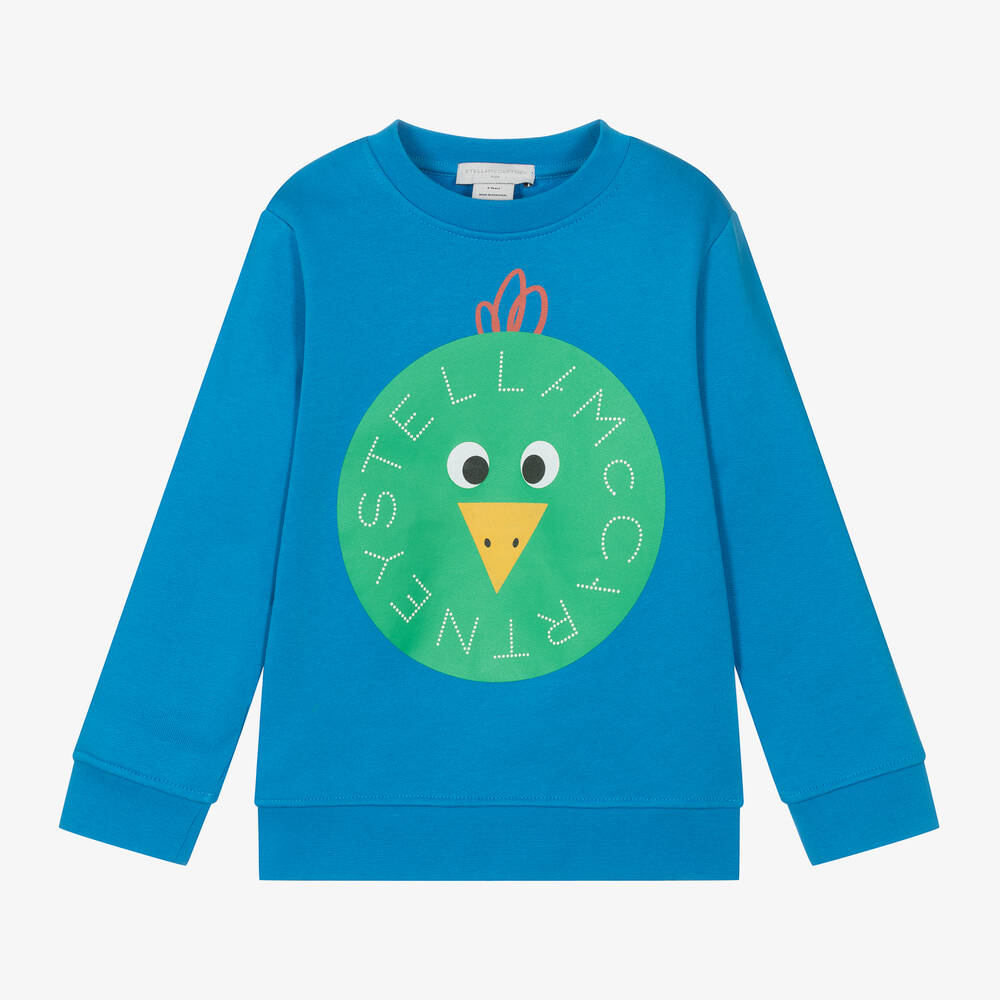 Casual and comfortable, a bright blue organic cotton sweatshirt for boys by Stella McCartney Kids. Featuring a fun farmyard theme, it has a circular chicken logo print on the front in green. This long-sleeved top is made mid-weight jersey, with ribbed trims and a cosy fleecy inside. The Stella McCartney fit can be quite small so choose a size up if you want room to grow.