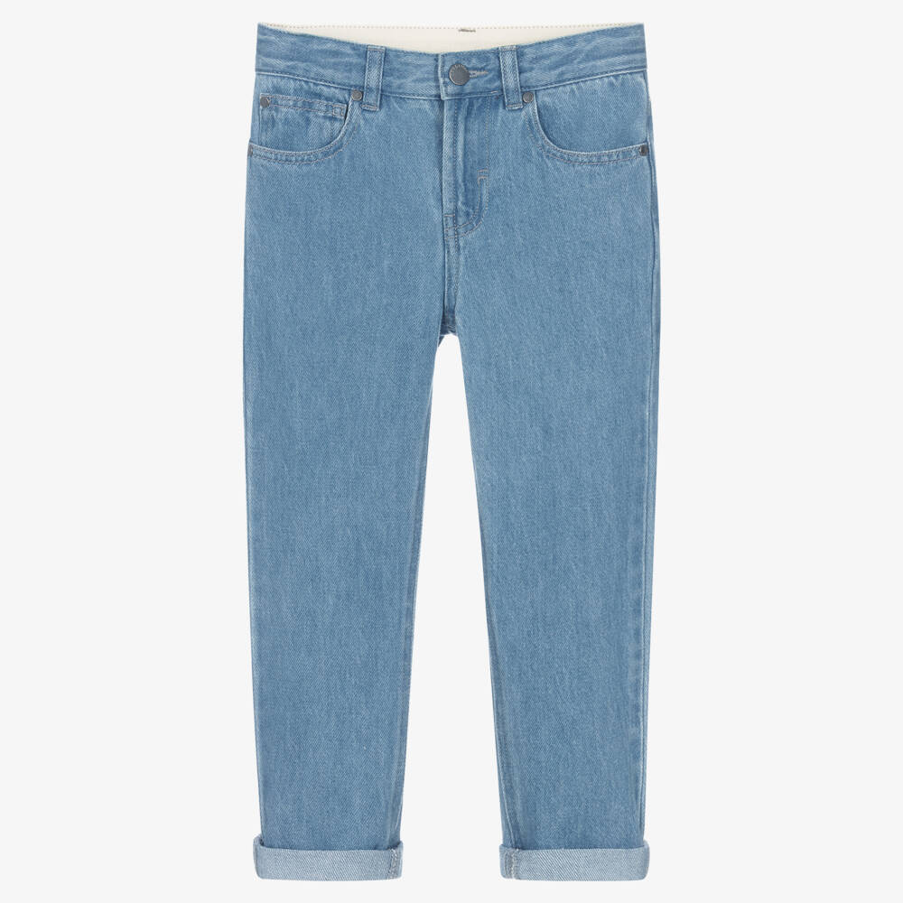 A pair of blue denim jeans for boys by Stella McCartney Kids, made in mid-weight organic cotton. These comfortable jeans are made in a regular fit with a slightly tapered leg and have the classic five pocket styling. The waistband is adjustable for a good fit and they fasten with a zip and clip fastener at the front. There is a branded black tab on the back for a subtle designer finish. The Stella McCartney fit can be quite small so choose a size up if you want room to grow.