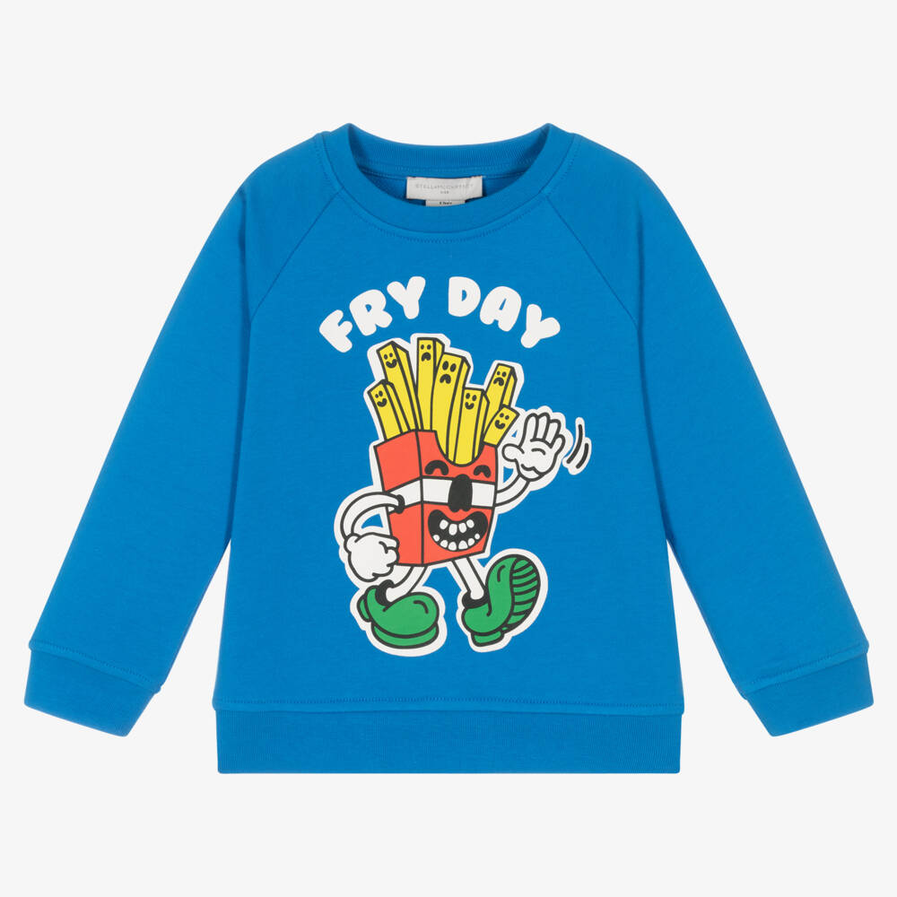 Blue crew neck sweatshirt for boys by Stella McCartney Kids, made in soft organic cotton jersey. The front is printed with a fun 'Fry Day' slogan in white and a playful cartoon fries graphic.