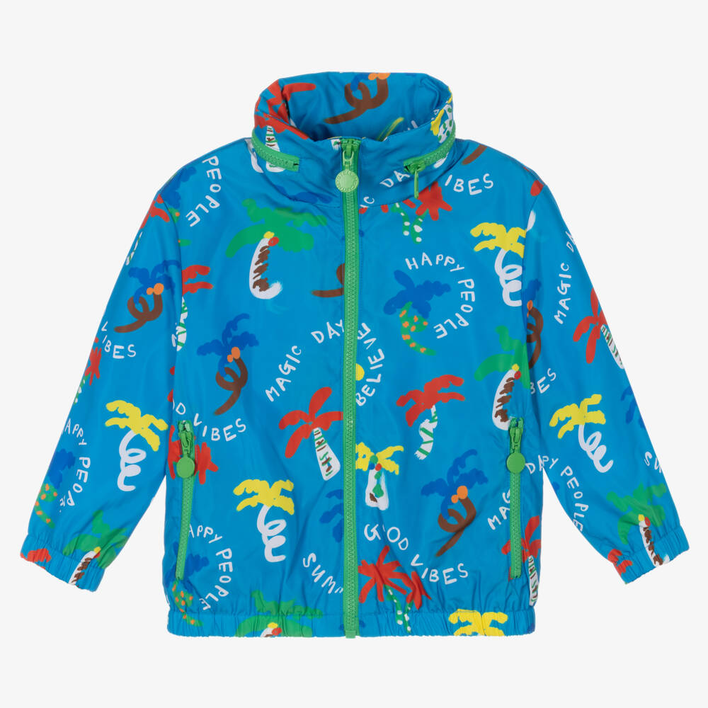 Blue jacket for boys by British brand Stella McCartney Kids, with a useful fold-away hood. Made in soft, silky, recycled fibres, it has a colourful tree print with positive white slogans. There are exposed green zip fastenings on the front, hood and pockets, all with logo pull tabs. It is lined in lightweight, breathable mesh and has elasticated cuffs and hem for cosiness.