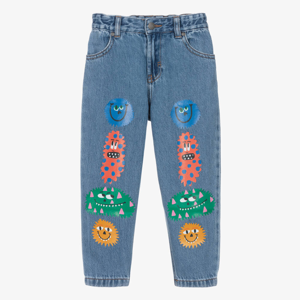 Fun, washed mid-blue jeans for boys from British brand Stella McCartney Kids. Made in soft organic cotton denim, they have colourful character monster prints on the front. For comfort, the waistband is gently elasticated and they fasten easily with a zip and hook. There are four useful pockets and they have a branded tab on the back for a discreet designer touch. The Stella McCartney fit can be quite small so choose a size up if you want room to grow.