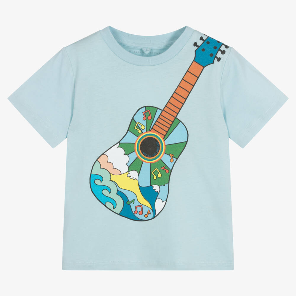 Fun blue T-shirt for boys by Stella McCartney Kids, made in soft organic cotton jersey. The front is printed with a playful guitar motif, in a quirky colourful style. The Stella McCartney fit can be quite small so choose a size up if you want room to grow.