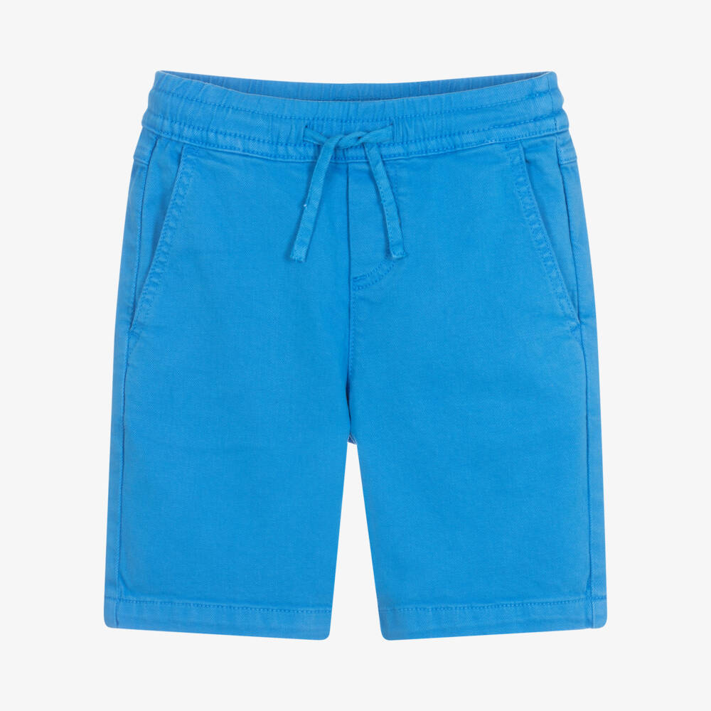 Blue organic cotton shorts for boys by Stella McCartney Kids, woven in soft stretch twill. Casual and easy to wear, they have a faux leather logo tab on the back of the drawstring waist and slanted front pockets. The Stella McCartney fit can be quite small so choose a size up if you want room to grow.