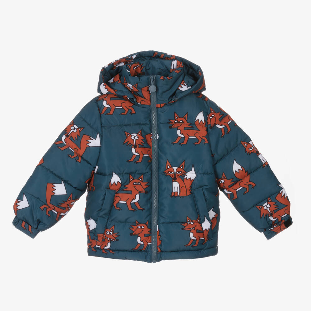 Funky blue puffer jacket for boys from Stella McCartney Kids, made in recycled material. With mid-weight padding and lined in super soft teddy fleece, it is warm and comfortable. The hood can be removed if not needed or for washing and the branded zip fastening is easy to use.