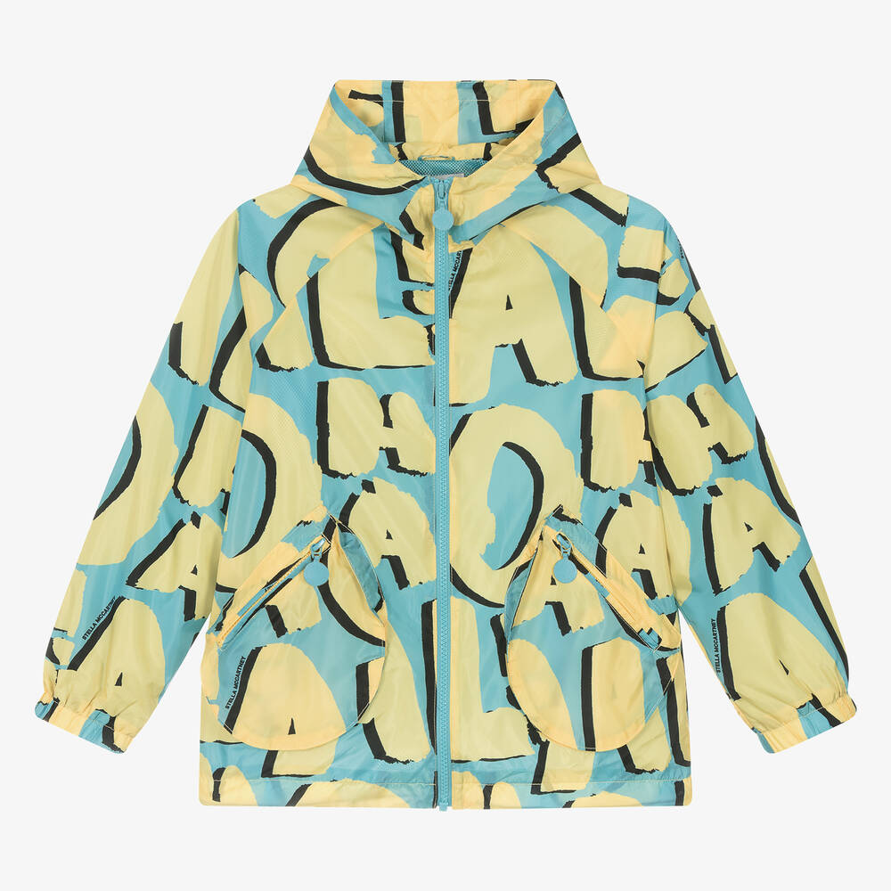A blue hooded windbreaker jacket for boys by British brand Stella McCartney Kids, patterned with bold, yellow letters from the word 'Aloha'. Silky and lightweight, it has a breathable mesh lining and elasticated cuffs. It fastens with a branded zip and has an internal adjustable toggle hem. Zipped pockets on the front complete the practical design. The Stella McCartney fit can be quite small, so choose a size up if you want room to grow.