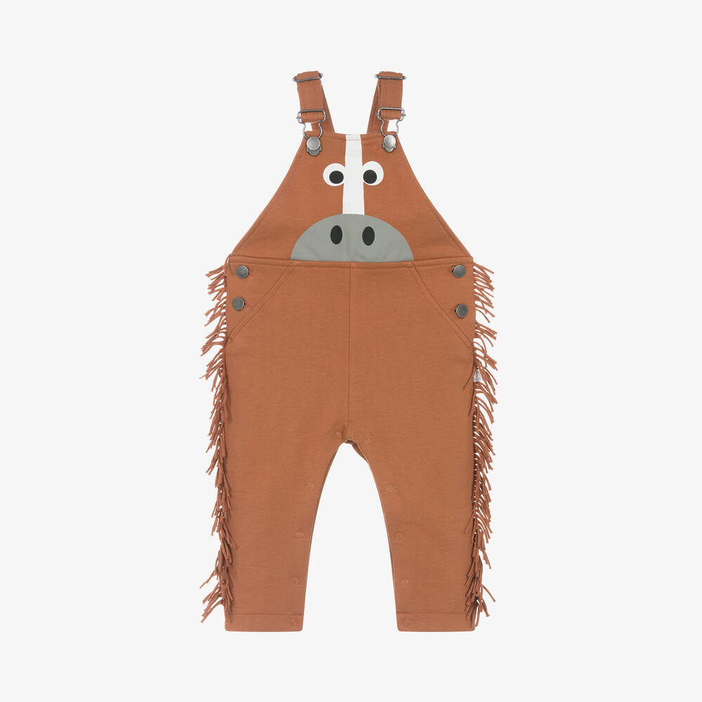 Casual and comfortable for little boys, these tan brown dungarees are by Stella McCartney Kids. They have a farm animal theme with a fun horse face printed on the bib and fringing detail down the sides. Made in soft organic cotton jersey, they have back pockets and branded button fastenings on the sides and on the adjustable shoulder straps. There are practical poppers between the legs to help with nappy changing. The Stella McCartney fit can be quite small so choose a size up if you want room to grow.